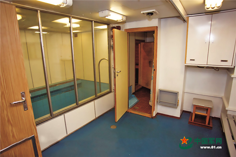 艇上著名的浴室,配备游泳池和桑拿房,虽然游泳池空间有限,但是在潜艇上这样的环境已经是相当不错了。