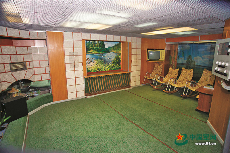 军官休息室,有躺椅、电视机、DVD等休闲设备。