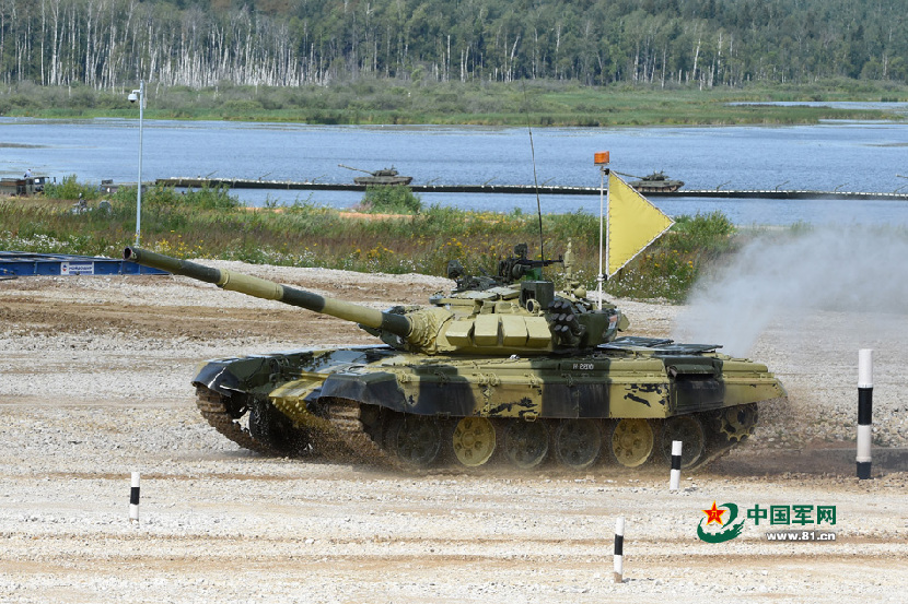 印度军队参加单车赛的车组驾驶T72在直道路段加速前进。特约记者吴苏琳