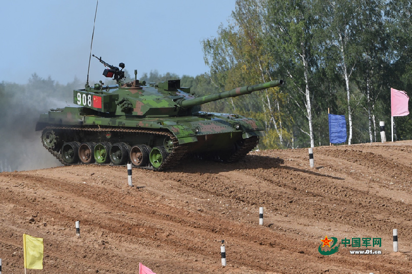 908号96A式坦克在连续通过涉水路段和雷场等障碍后,开足马力高速冲上土岭。特约记者吴苏琳