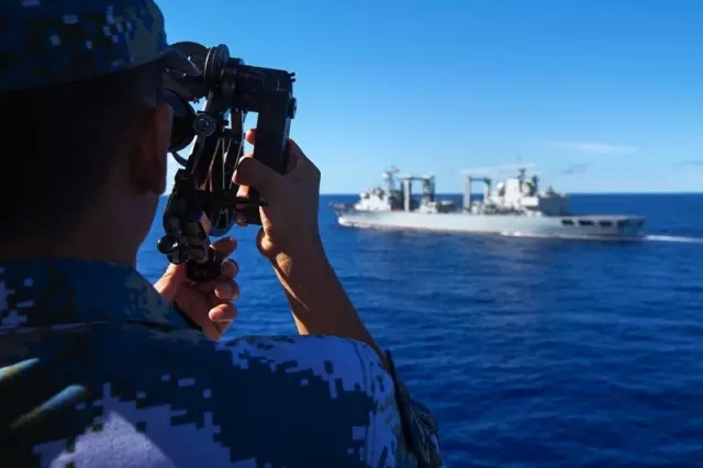 上午7点,长春舰正在逐步接近巢湖舰,副航海长何坊使用六分仪实时测量两舰的横向距离。虽然已有许多更为先进的手段可以测量舰艇间距,但传统的六分仪测量依然不可替代。