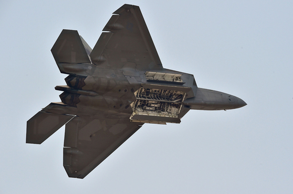 资料图:10月19日,在韩国城南市,一架美军F-22战斗机在媒体预展上表演。