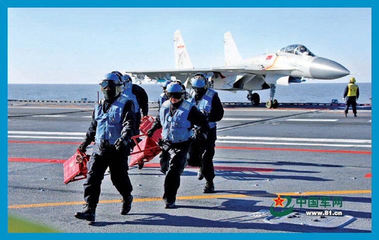 歼-15舰载战斗机即将滑跃起飞,航空保障人员撤收轮挡。