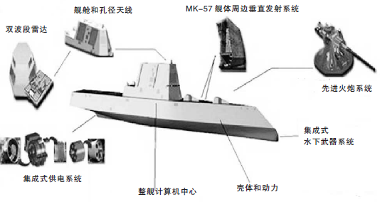 冷战结束后,美国海军的战略方针从冷战时期的大洋海战,逐渐演变成对陆地上的武力投送,以应付纷扰的地区性冲突。1994年9月,美国海军提出所谓“前沿-由海向陆”战略,首度将近岸作战、支援对地攻击作为海军主要任务之一,具体要求是舰队能对深入陆地185千米的地面部队实施支援,这个距离也成为日后DD-X隐身战舰的射程依据,后来该舰的设计和建造就在这一指导思想下进行。据资料报道,除了隐身技术外,该舰还先后采用以下十大最新技术: