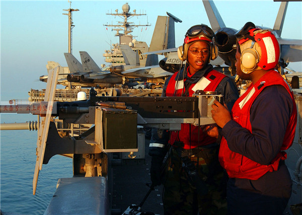 每隔一段距离,航母都会在舷侧布置机枪架,做到了360度无死角。图中就是两名处于警戒状态的航空军械员。