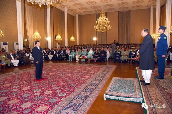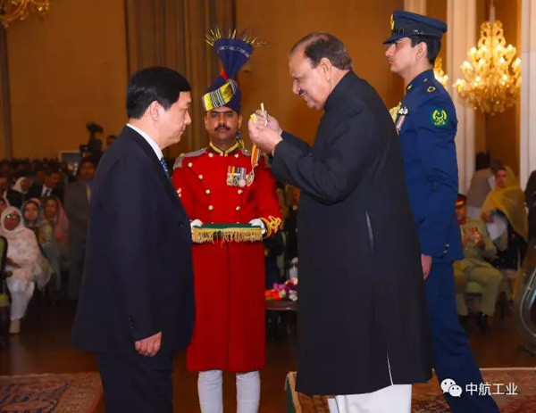 3月23日,巴基斯坦伊斯兰共和国国庆日,中国航空工业集团公司科技委副主任、中巴联合研制的“枭龙”飞机总设计师杨伟在伊斯兰堡总统府接受马姆努思·侯赛因总统授予的“卓越之星”国家荣誉奖章。