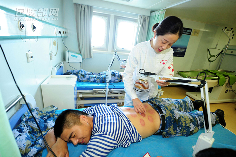 8月16日,和平方舟医护人员在主平台门诊为扬州舰舰员进行中医诊疗。江山 摄