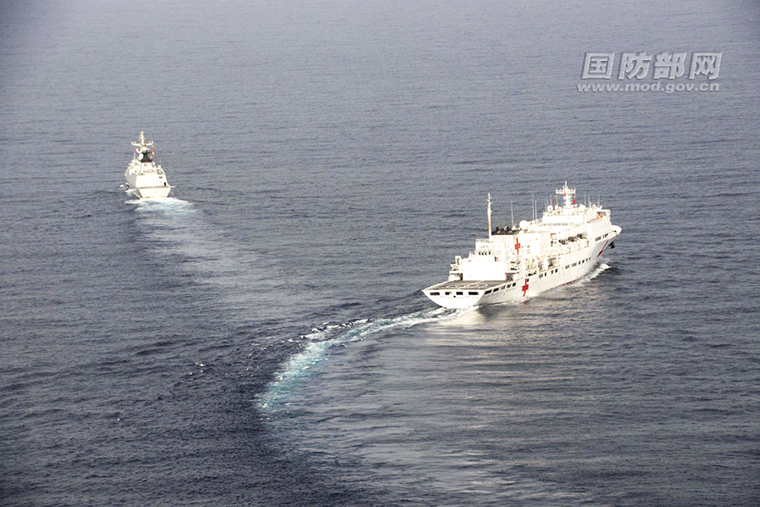 8月16日7时35分许,中国海军和平方舟医院船与正在执行第26批护航任务的扬州舰在亚丁湾东部海域会合后组织编队运动。江山 摄