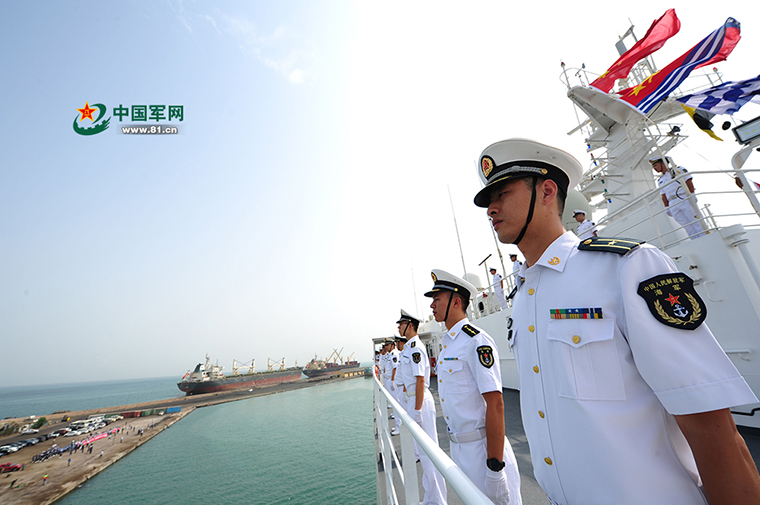 8月23日,中国海军和平方舟医院船缓缓驶进吉布堤港时,海军官兵在甲板列队站坡。江山 摄