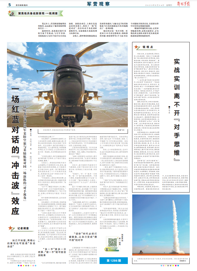 “一支军队最可怕的不是没有对手,而是没有‘可怕的对手’。”对抗训练的目的是发现不足、研究对手、寻找对策,树立一个形神兼备的“强敌”至关重要。“一切问题都是因为对手的存在。”碰到真正的对手,才可能产生惊心动魄的对局。凡是对作战对手“雾里看花”、满足于自我训练、“左右手互搏”的军队,必然会在战争中受到应有的惩罚。