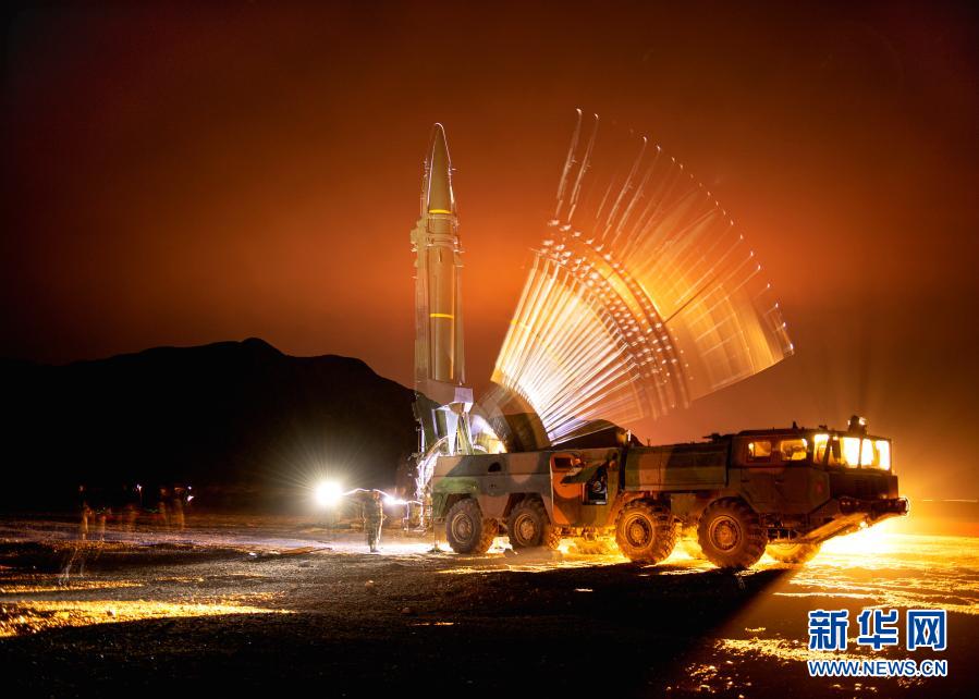 火箭军某旅在发射场进行夜间火力突击演练(资料照片,多重曝光)。新华社发(刘明松 摄)
