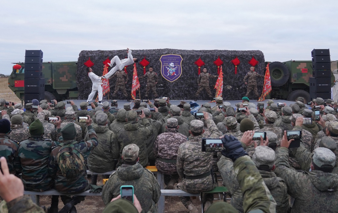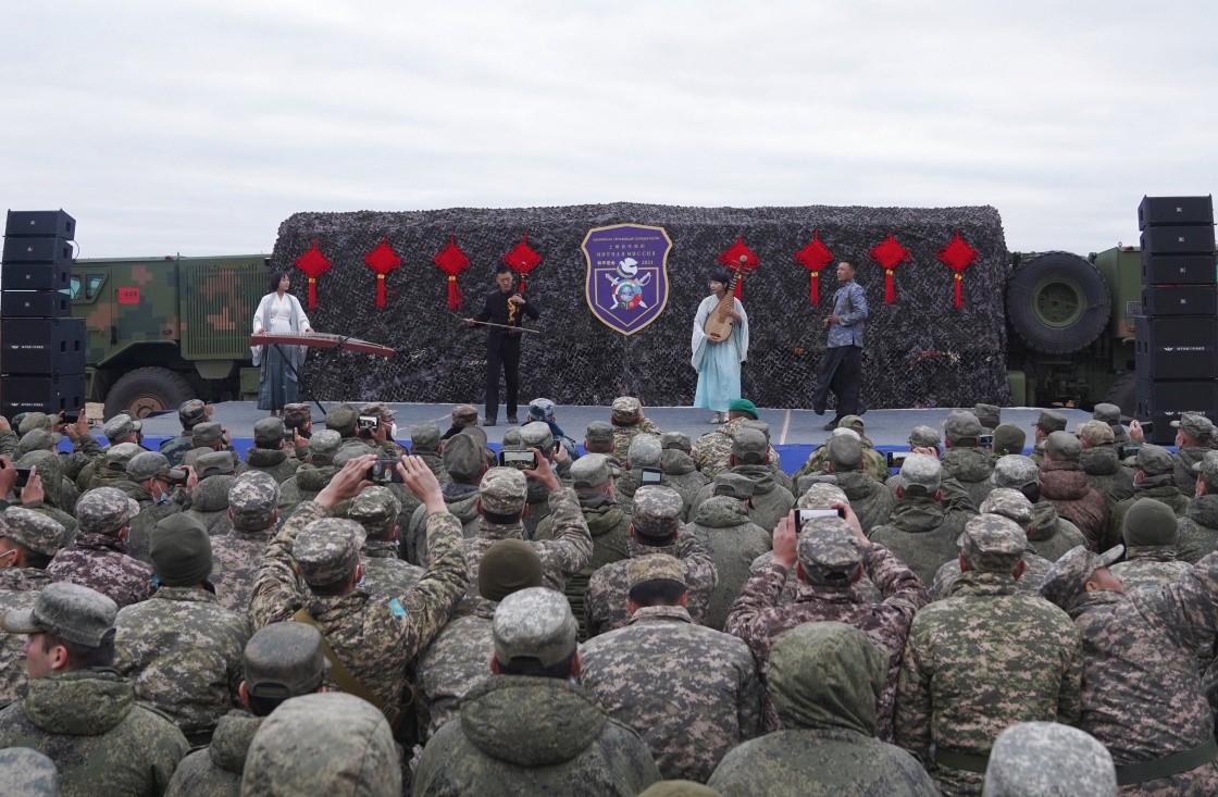 9月17日,在俄罗斯奥伦堡州东古兹,各国参演官兵在中方参演部队举办的“中国文化日”活动上欣赏“中国味”十足的文艺演出。新华社记者 梅世雄 摄
