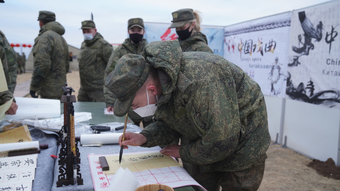 9月17日,在俄罗斯奥伦堡州东古兹,各国参演官兵在中方参演部队举办的“中国文化日”活动上体验中国书法。新华社记者 梅世雄 摄