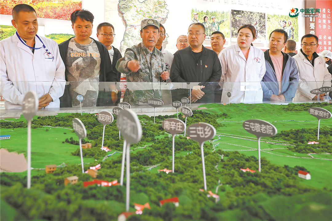 张连印(左四)向地方干部群众讲述自己退休后植树造林的经历。