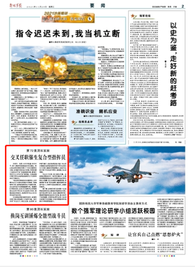 解放军报讯 张朋、冯华华报道:初冬时节,第72集团军某旅组织对抗演练。刚从炮兵排长转岗未满3个月的侦察排长王强,运用新学到的战术技能,带领侦察小组成功对“敌”实施渗透侦察,精准引导后方火力打击“敌”炮阵地。这是该旅开展不同专业连排级指挥员交叉任职带来的可喜变化。