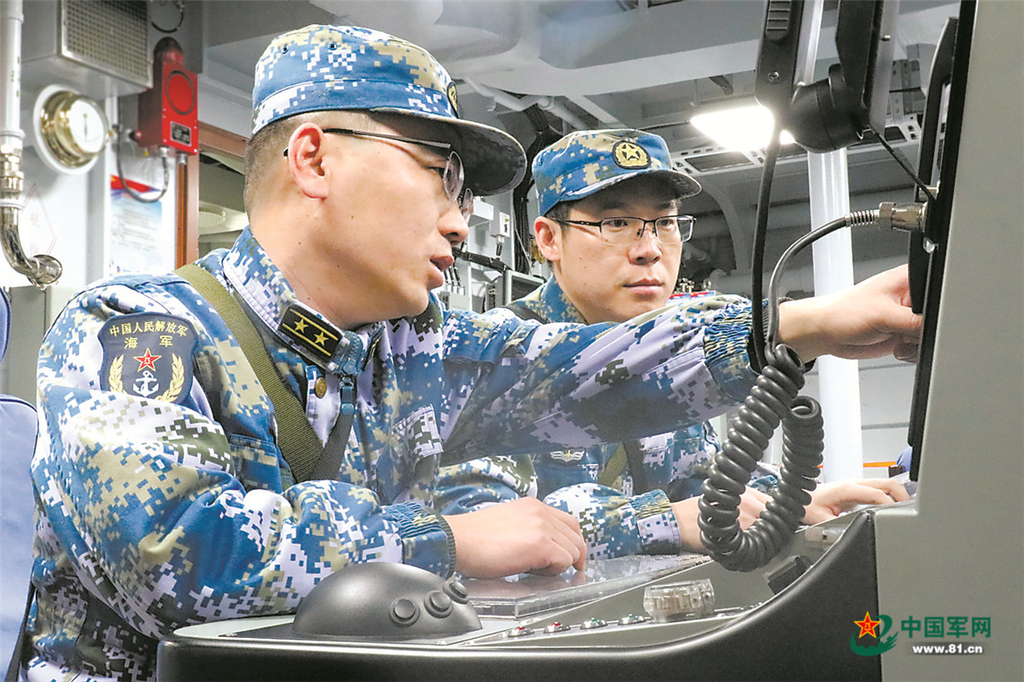 战斗升温,“敌”海上支援兵力悄然出动,伺机发起偷袭。舰艇作战指挥室内,官兵目光紧盯显控台。伴着键盘敲击声,“敌”情飞速传至各个作战单元。指挥员沉着应对战场态势,指挥舰艇快速机动占领有利阵位,通过修正战斗航向牢牢锁定“敌”舰方位,做好导弹攻击准备