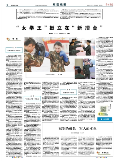 葛亚萌身上有一种“敢于面对”的坚韧——像她赛场上的经历一样,握紧拳头出拳、再出拳,面对成长路上的挫折与挑战,她总是近乎倔强地坚持。她经历了奋力向上时的艰辛,如今更要耐住归于平常后的考验——基层火热的熔炉冶炼、锻打着她,让“女拳王”的名号与军人打仗的本位不断靠拢,让她的拳头对准新的标靶。其实,葛亚萌面对的是一个新的“擂台”、一场更有分量的“拳赛”、一段更有跨度的军旅人生。