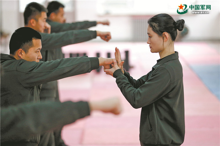 训练场上,搏击教员葛亚萌脸上沾满了沙土。她不断腾挪,寻找空当把拳头击向对手。