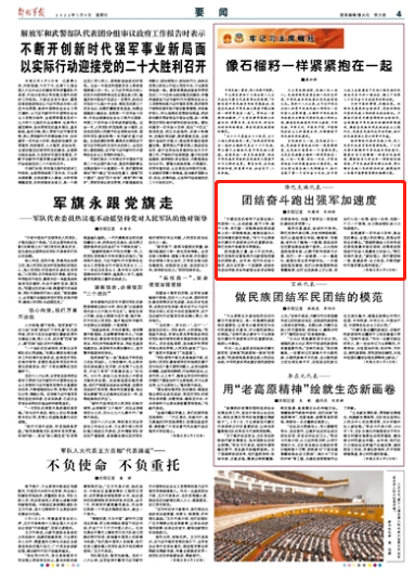实现建军一百年奋斗目标,是全党的事业、全国人民的事业,更是全军官兵的事业。“围绕明确奋斗目标形成的团结是最牢固的团结,依靠紧密团结进行的奋斗是最有力的奋斗。”降巴克珠代表说,“新征程上,我们要团结一致、锐意进取、合力攻坚,不断把新时代强军事业推向前进。”