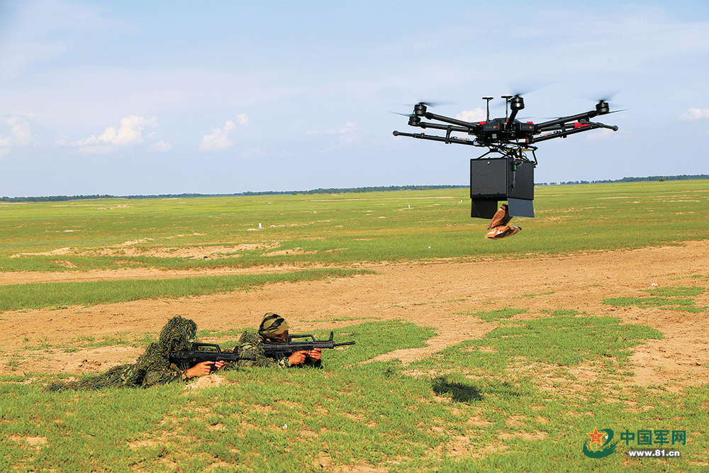 不多时,3架小型无人机从远处快速飞来,稳稳降落在侦察队员身旁。田李阳一边指挥狙击手带领观察手进行警戒,一边命令其他队员快速前出到无人机近前,打开下方吊挂的空投箱,取出打包的热食和单兵干粮。