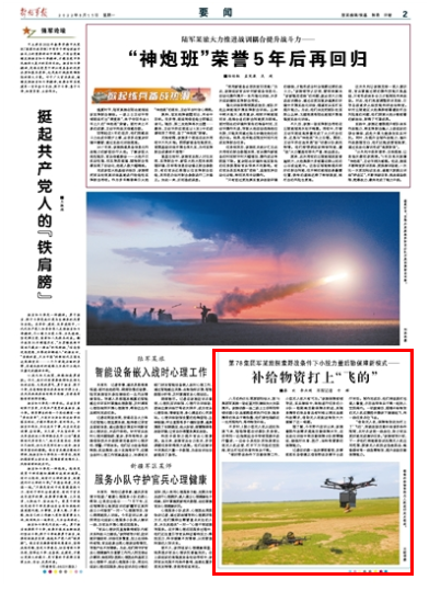 “借助无人机,保障物资犹如打上了‘飞的’,突破战场后勤补给诸多条件限制,点对点送到一线战位,助力官兵更好地完成演训任务。”该旅领导介绍,下一步他们将继续尝试拓展无人机应用范围,探索无人机投送急救药品、维修器材等一线急需物资,提升战场后勤保障能力。