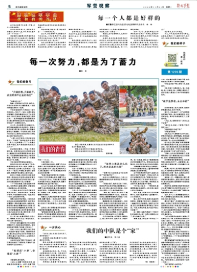 任职4个多月,我看见那些奋力拼搏的轨迹和始终如一的奉献,映照着中队每名官兵的身影,远比营区门前龙虎榜上的数字更牵动人心。
