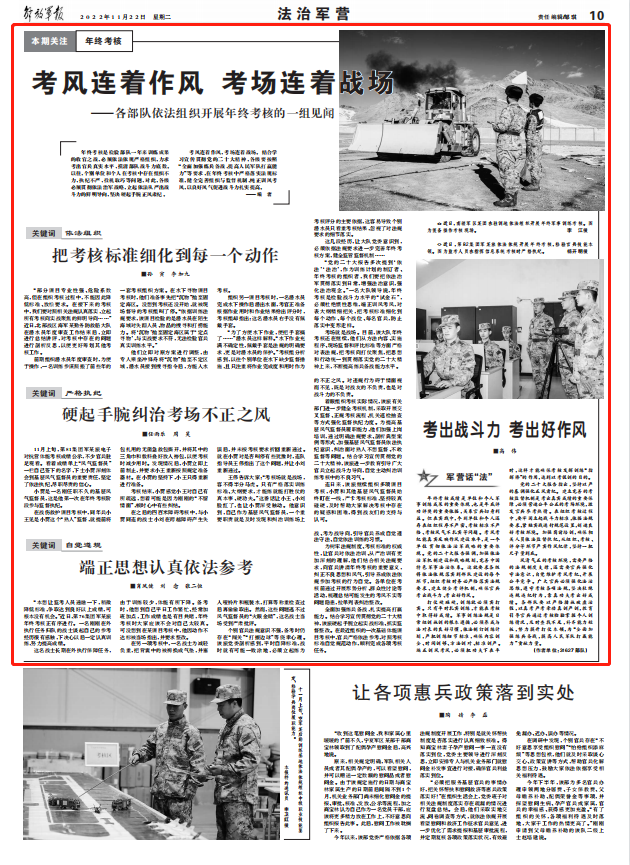 年终考核成绩是单位和个人军事训练成果的重要体现,也是年底评功评奖的重要依据,关系官兵切身利益。但在实践中,个别单位和个人还存在组织程序不严密、考核标准不严格、考核风气不扎实等问题。考风考纪能真实反映作风建设水平,是一个单位贯彻依法治军战略的重要体现。党的二十大报告强调,加强依法治军机制建设和战略规划,完善中国特色军事法治体系。这就要求各级将依法依规落实到部队建设的每个环节,组织考核时务必严格落实法规要求、建立健全考评机制,确保官兵考出战斗力、考出好作风。