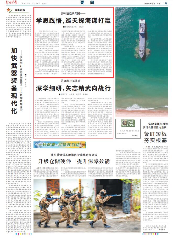 他们针对部队驻地分散、战备任务繁重等实际,及时收集整理党的二十大相关内容,并通过线上学习等形式,将大会精神传达至在外执行任务的官兵。他们还在训练间隙开展“翼下课堂”,制作应知应会口袋书下发基层,通过组织官兵撰写心得体会、重温入党誓词等形式,引导大家学在战位、悟在一线,不断激发建功深蓝的热情斗志。