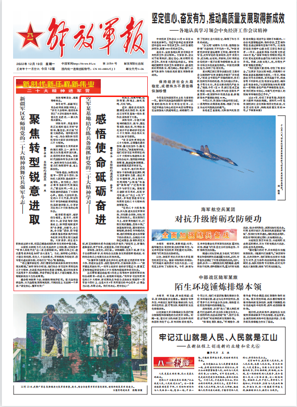 “学习宣传贯彻党的二十大精神,必须强化思想引领,强化担当作为,强化工作落实。”该基地领导说,他们把学习宣传贯彻党的二十大精神与推进练兵备战结合起来,坚持驻训转进到哪里、航迹延伸到哪里,就在哪里灵活开展学习。