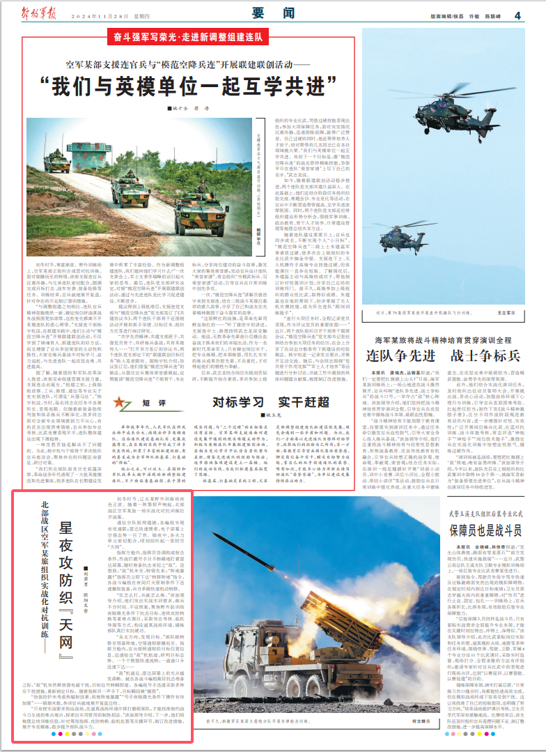 通信分队组网建链,各编组实现有效通联;雷达快速搜索,电子屏幕上空情态势一目了然。暗夜中,各火力单元密切配合,顷刻间织起一张防空“天网”。
