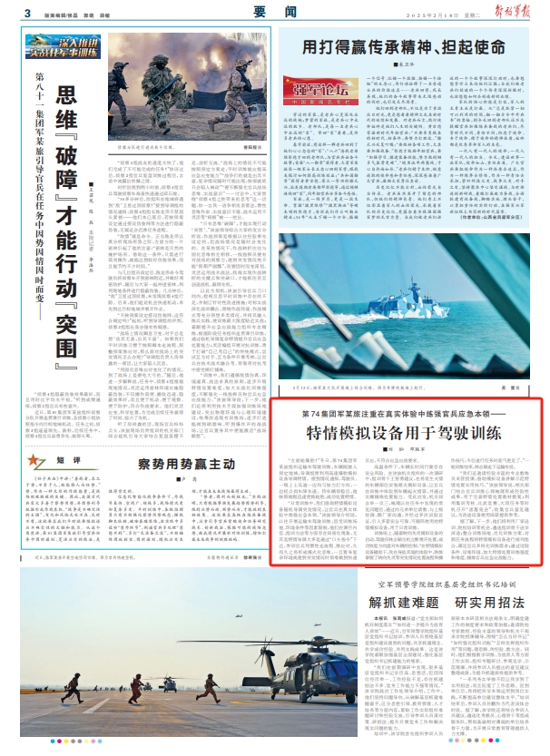 “我们还邀请经验丰富的专业教练员来营授课,借助模拟设备讲解示范特情处置实用技巧。”该旅领导说,相关部门结合官兵训练心得梳理形成经验性成果,用于完善特情处置教材教案;利用集训考核、比武竞赛、大项任务等时机召开“诸葛亮会”,收集官兵意见建议,为改进设备使用场景提供参考。