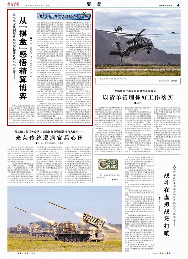 “不仅如此,兵棋推演还有利于修订完善作战方案、改进问题不足,促进训练质效提升。”该支队兵棋小队骨干余建告诉记者,兵棋推演不仅拓宽了他的战场视野和全局观念,还让他学到了不少其他军兵种作战知识,对体系作战的认识理解更加深刻。