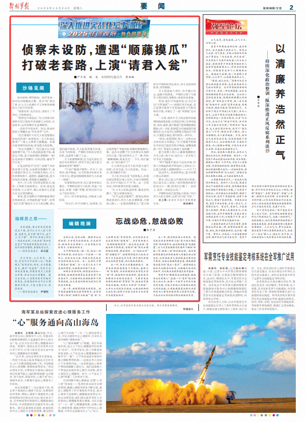 这一年,敌情预判催生新思维。陆军某旅着眼智能化战争新特点,在考核中精心构设“指挥节点毁瘫”“遭‘敌’无人机群突袭”等新特情,让训练场成为未来战场的“镜像场”。空军某部建立“电磁频谱特情库”,通过动态追踪、智能分析干扰规律,实现对“敌”战术企图的精准洞察、提前预判。从“临机应对”到“前瞻设计”,敌情预判意识已经成为战斗力生成的先导力量,牵引部队训练向未来战争靠拢、向打赢标准聚焦。