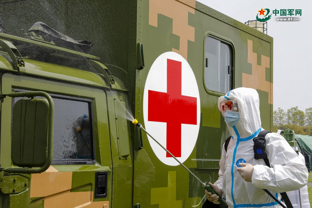 防疫组成员对车辆进行洗消。唐田 摄