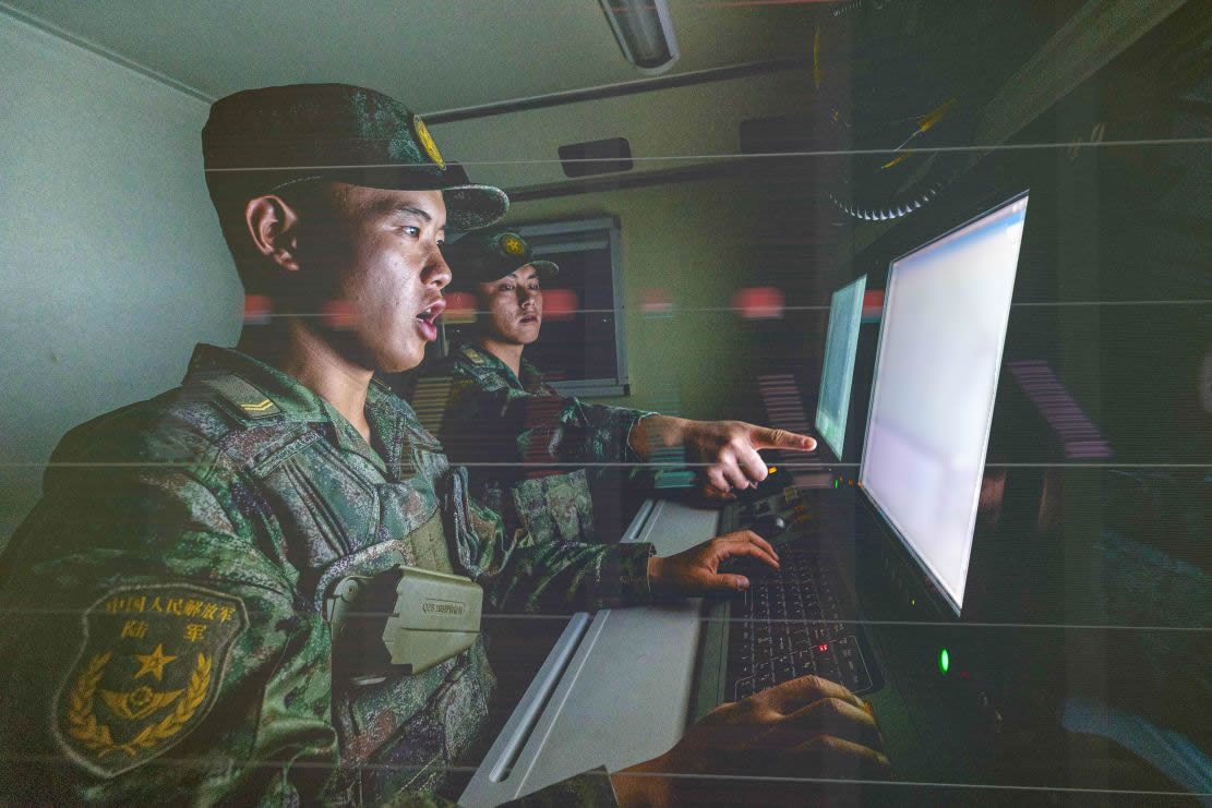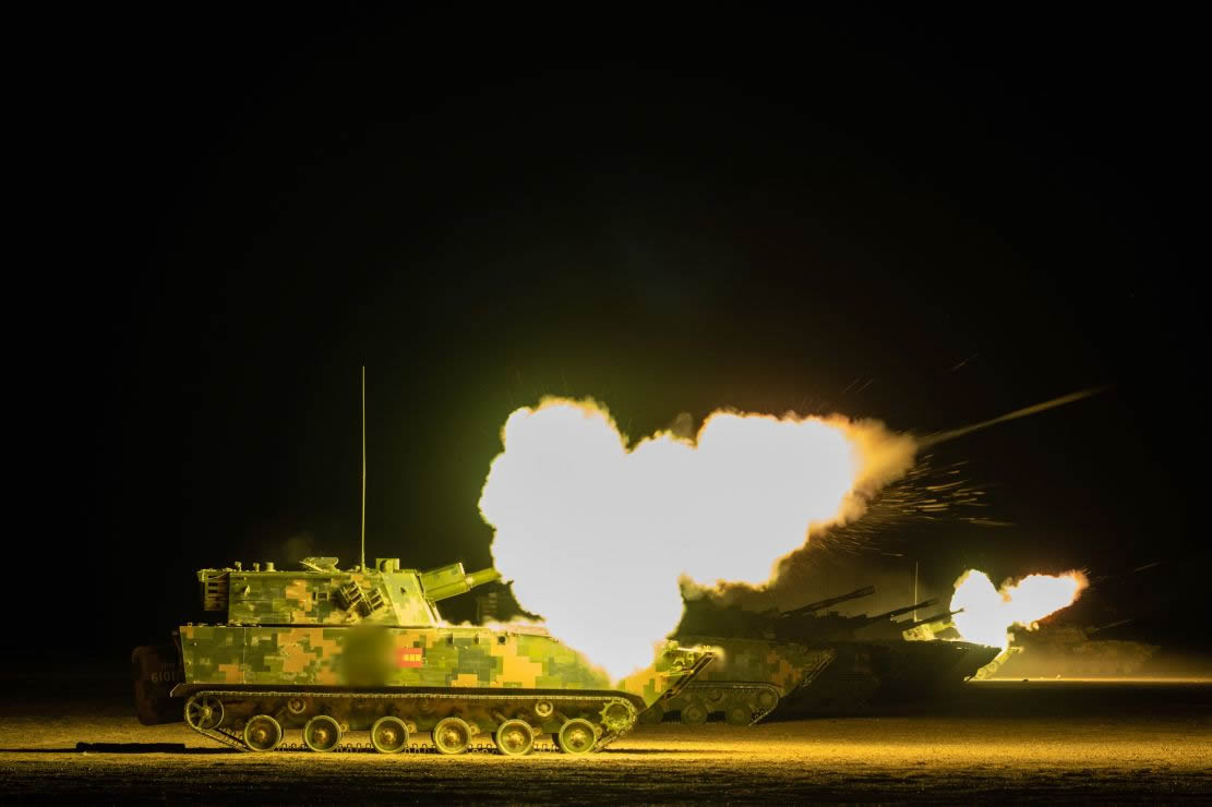 夜色中,无人机抵近进行空中侦察,将目标坐标回传至炮兵指挥车。射击参数随即下发至各炮火控系统,火箭炮分队和榴炮分队快速装定诸元。指挥员一声令下,一发发炮弹呼啸而出,对“敌”阵地展开火力打击。