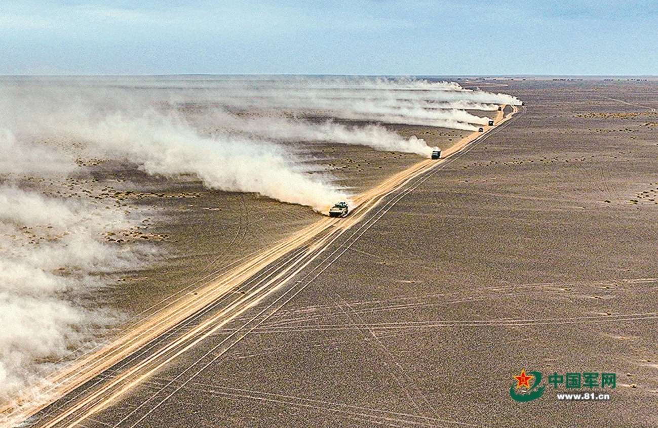 随着数枚信号弹呼啸升空,训练拉开帷幕。战车编队向目标地域疾驰而去,一路卷起滚滚尘烟。