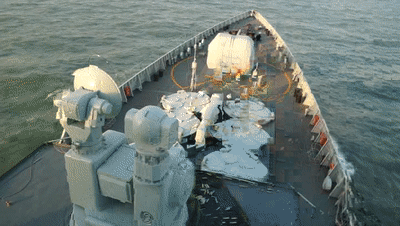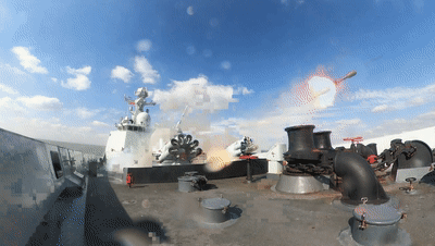 副炮对空应用射击是此次训练的“重头戏”。在接下来的训练中,模拟反舰导弹的新型靶机向编队高速袭来。危急关头,滨州舰、常州舰、西安舰副炮飞旋,数道火舌喷涌而出在舰艇周围筑起一道弹幕,目标在战舰不远处凌空炸裂。
