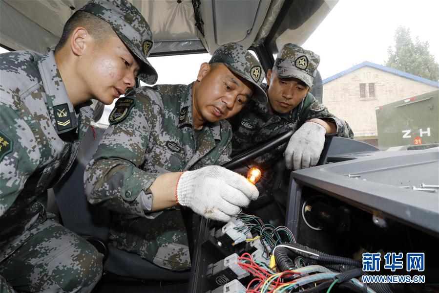 联勤保障部队某团修理技师张俊凯(中)向战友传授维修技能(2019年8月21日摄)。新华社发(曾曾 摄)