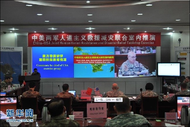 中美两军首次人道主义救援减灾联合室内推演现场。  王德思