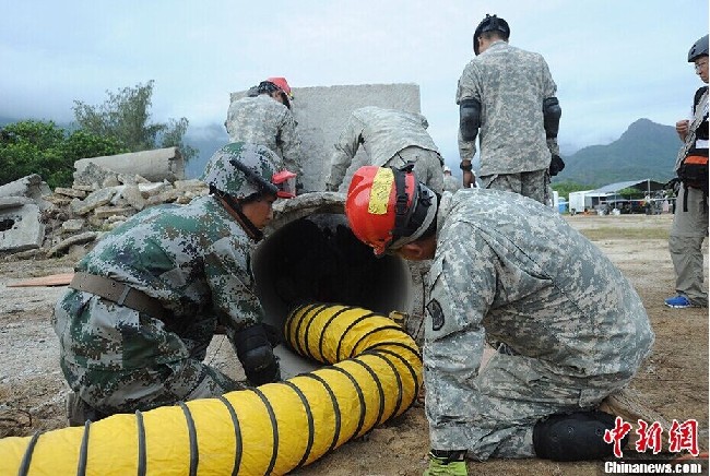 中美两军首次人道主义救援减灾联合实兵演练中,双方参演人员联合向地震中被困人员提供生命支持。 张蔚然