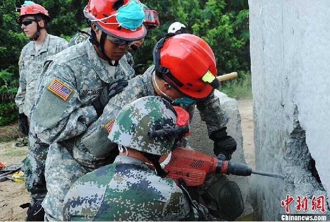 中美两军首次人道主义救援减灾联合实兵演练中,双方参演人员联合进行破拆,救助地震中被困人员。张蔚然
