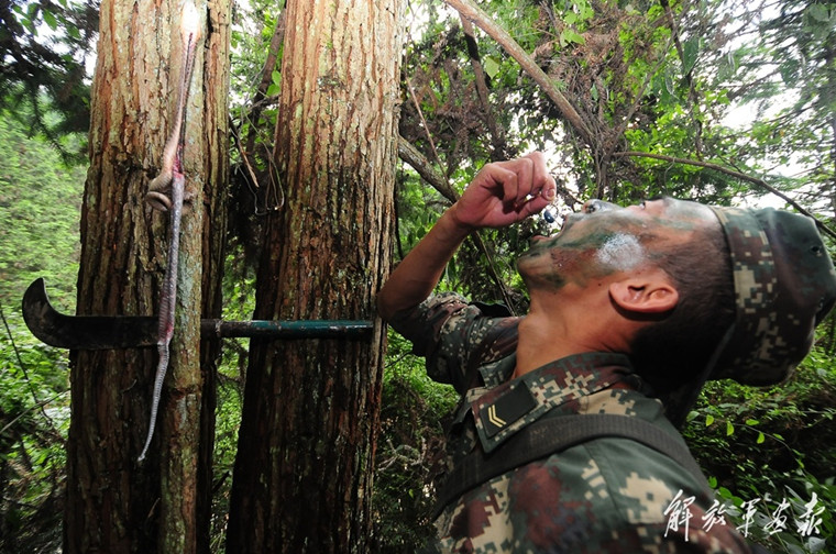 军人血性从哪里来?深山老林,第二炮兵某团特种警卫训练,三天只发一天干粮,官兵吃蛇肉、吞青蛙,寻找一切可填饱肚子的食物。体能训练,设8种障碍,每天完成3趟以上;射击训练,在太阳下一趴就是半天;五公里武装越野全副武装加袋……
