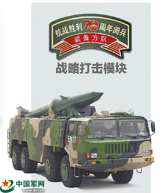 这是战略打击模块唯一一个由两型导弹武器混编的方队。两型导弹,两支劲旅,两柄利剑,首次合璧。长剑昂首、东风雄姿,瞬间掀起了阅兵现场的高潮。