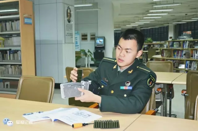 然而,在该校去年的科技创新成果展示会上,他一举成名,由他设计的“95式步枪快速压弹器”与“传统压弹器”进行现场PK:2个弹夹60发子弹推送入夹,同一人操作,传统压弹器用时1分08秒,快速压弹器仅用时38秒!在场的该校副校长、博士生导师刘光斌不禁竖起大拇指:“这个学员有想法,这项发明了不起。”