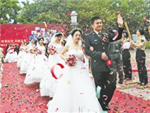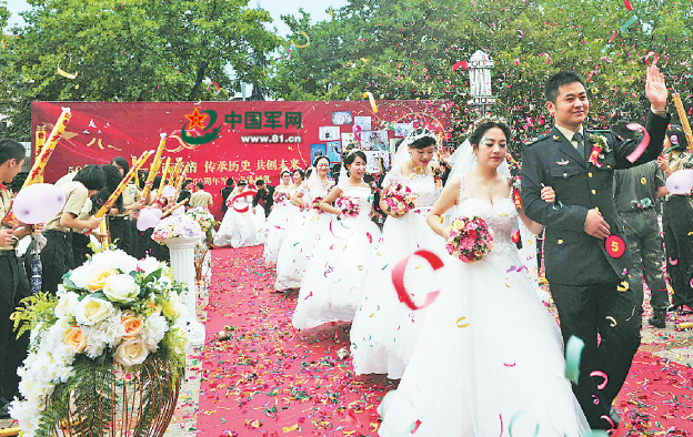 8月1日,火箭军某基地为驻守大山深处的官兵举行“50年50人——见证爱情、传承历史、共创未来”主题婚礼,为4对功臣模范夫妇举办纪念婚礼;为通过“军营红娘”喜结连理的21对新婚官兵举办结婚典礼,让他们在战友的祝福中度过八一建军节。