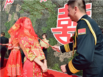 9月27日上午,笔者在婚礼筹备现场看到,营区彩旗飘飘、张灯结彩,处处洋溢着爱的芬芳。官兵们正忙个不停,有的在水泥路上铺红地毯,有的给树丛挂布景,还有的用鲜花、彩带装点四周,整个营区充满了欢声笑语。8时07分,举行升国旗仪式,12对夫妻面对国旗许下爱的誓言。精彩的锣鼓表演、舞龙舞狮表演、腰鼓表演等拉开了集体婚礼的帷幕。在官兵和亲属的欢呼声中,12名官兵身着军装,携手身着中式礼服的新娘,伴着《婚礼进行曲》走上红地毯,穿过“幸福门”,步入集体婚礼现场……参加婚礼的官兵、亲朋好友纷纷举起相机,为他们定格最美瞬间。