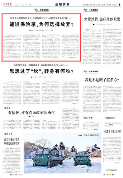 必须承认,友邻单位“招兵买马”,我心动已久。先不说“脖子以下”改革推开后,老单位改革何去何从尚未可知,单就舞台而言,新单位肯定更大更广,从某种程度上说,就意味着进了“保险箱”——新单位壮大队伍还来不及,怎会有被裁撤的风险呢?显然,这对于一心想着长期服役的我而言,无疑是一个巨大诱惑。