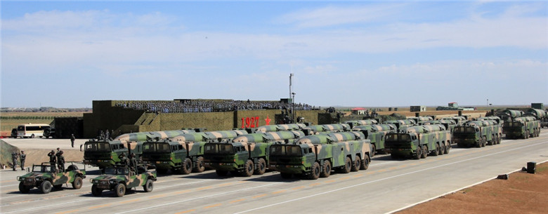 7月30日,庆祝中国人民解放军建军90周年阅兵在位于内蒙古的朱日和训练基地举行。中共中央总书记、国家主席、中央军委主席习近平检阅部队并发表重要讲话。这是常规导弹第2方队。新华社记者 查春明 摄