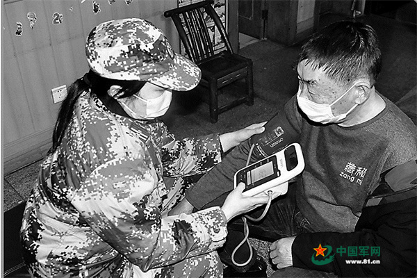 春节前夕,“张超民兵先锋连”民兵到张超烈士家中慰问,并为他的家人测量血压。朱 林摄