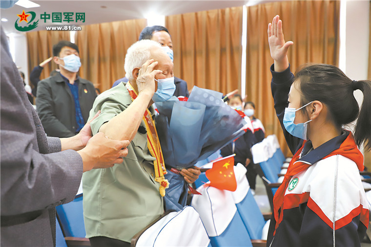 96岁老红军王新明应邀到清丰县第一实验小学做报告时与少先队员互致敬礼。王友恒摄